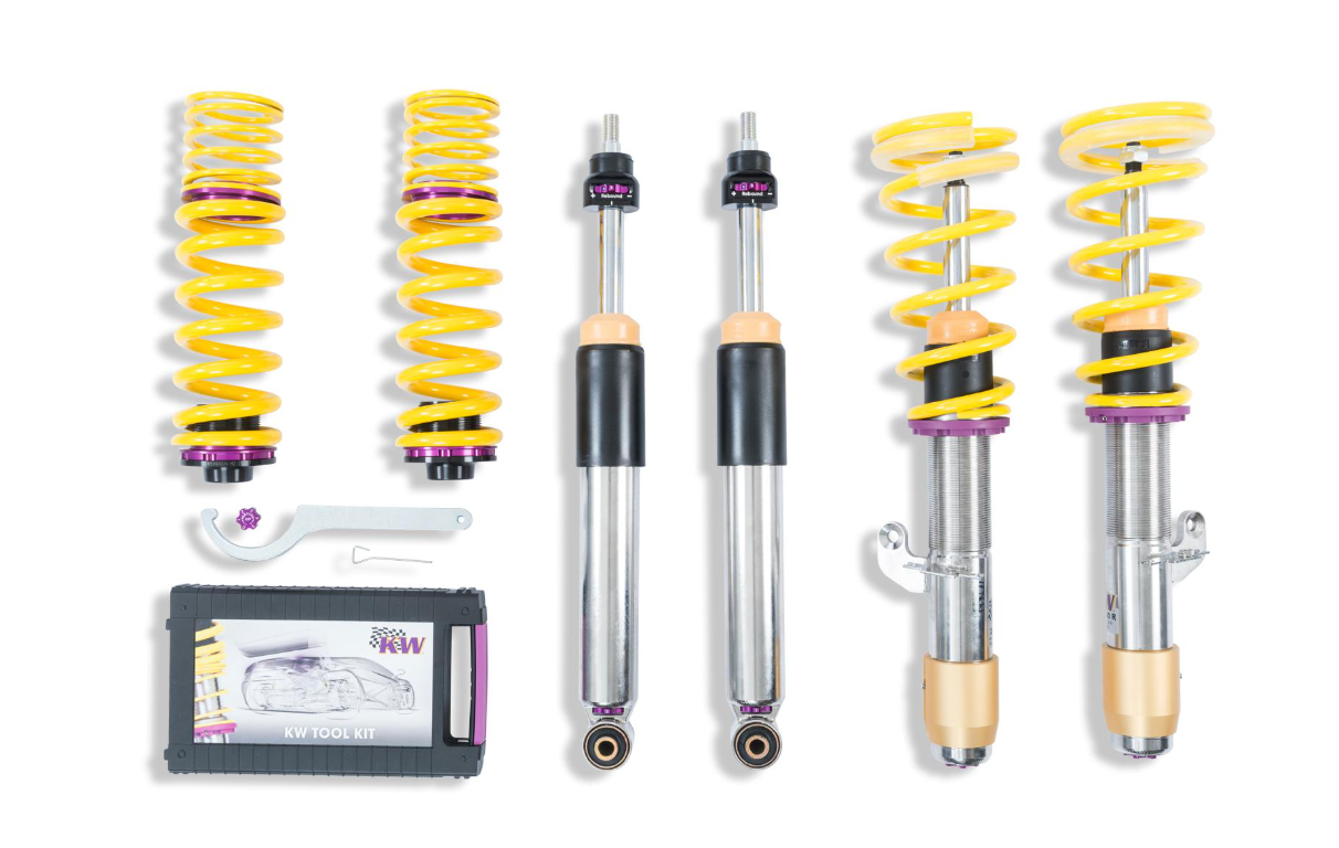 The KW coilover kit V3 ''inox-line'' is the perfect accessory for performance-oriented drivers and tuning enthusiasts who put a great demand on their suspension. The separately rebound and compression damping adjustable dampers with their _''_''well-thought-through_''_'' click adjustment allow a perfect setup. So it is easy to influence the steering behaviour, directional stability, tire grip and handling characteristics when driving on the limit.