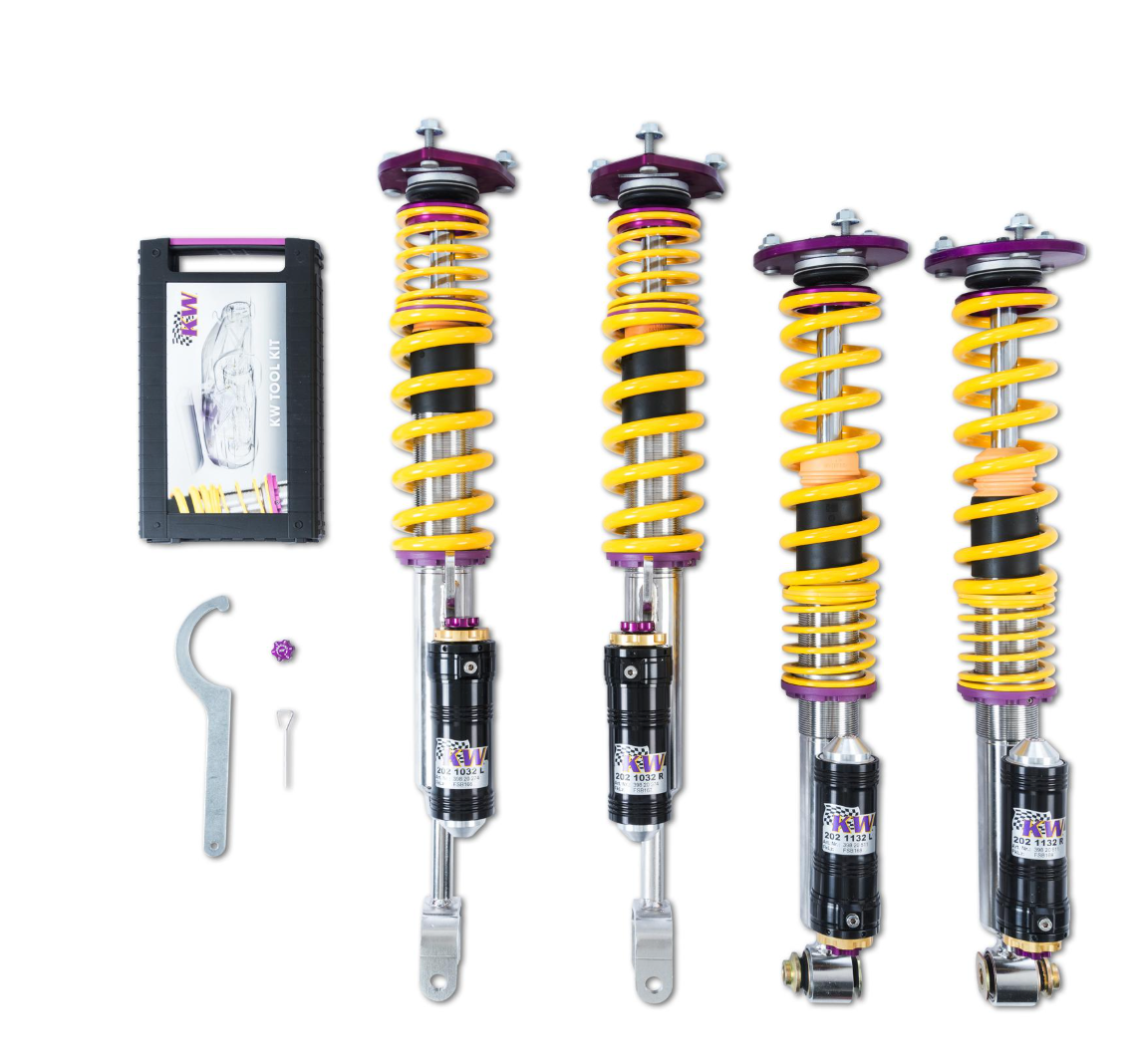 If you have already made your first performance modifications to your vehicle our KW coilovers V4 will compliment your upgrades. The patented KW-valve technology for separate adjustment of rebound and compression damping allows you to individually setup your suspension.The adjustable KW bottom valve adjusts the low-speed range of the compression level in twelve clicks.